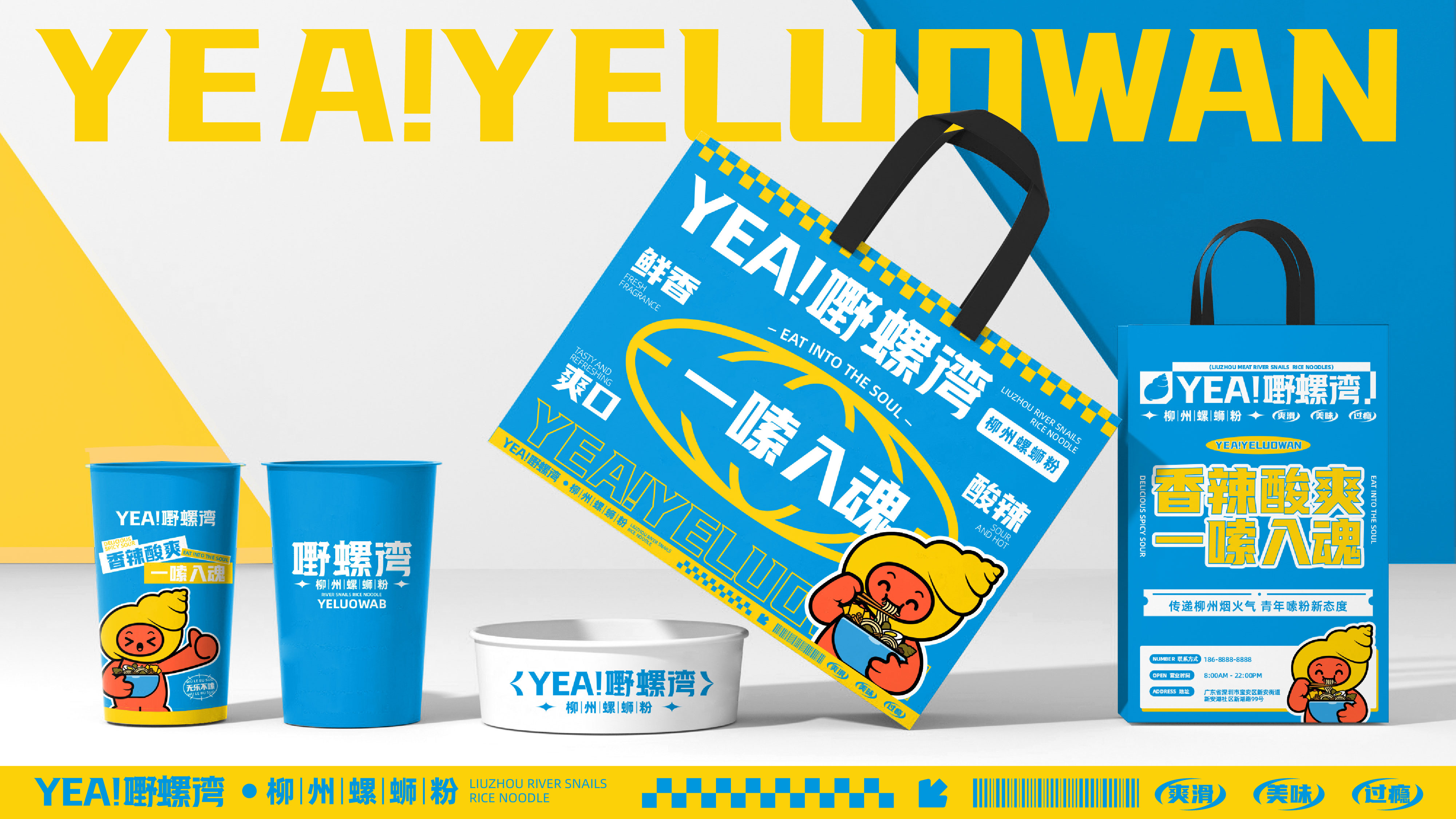 嘢螺灣品牌標(biāo)志以黑體字為原型,提取螺螄堅(jiān)硬外殼的特點(diǎn)結(jié)合年輕化的視覺特點(diǎn)進(jìn)行藝術(shù)化設(shè)計(jì),螺擬人化與企業(yè)元素結(jié)合,形成獨(dú)特獨(dú)有的品牌形象,形成品牌競(jìng)爭力 。我們處于鬧市,卻向往柳州的寧靜,中式市井感與味覺刺激的螺螄粉結(jié)合。同時(shí)將螺螄的外形進(jìn)行人物形象IP化,打造一個(gè)年輕互聯(lián)網(wǎng)趣味化的形象,將其延展至整個(gè)視覺體系中,借勢(shì)市井螺螄文化,快速讓品牌建立“根基”,搶占品類歷史文化資產(chǎn)。